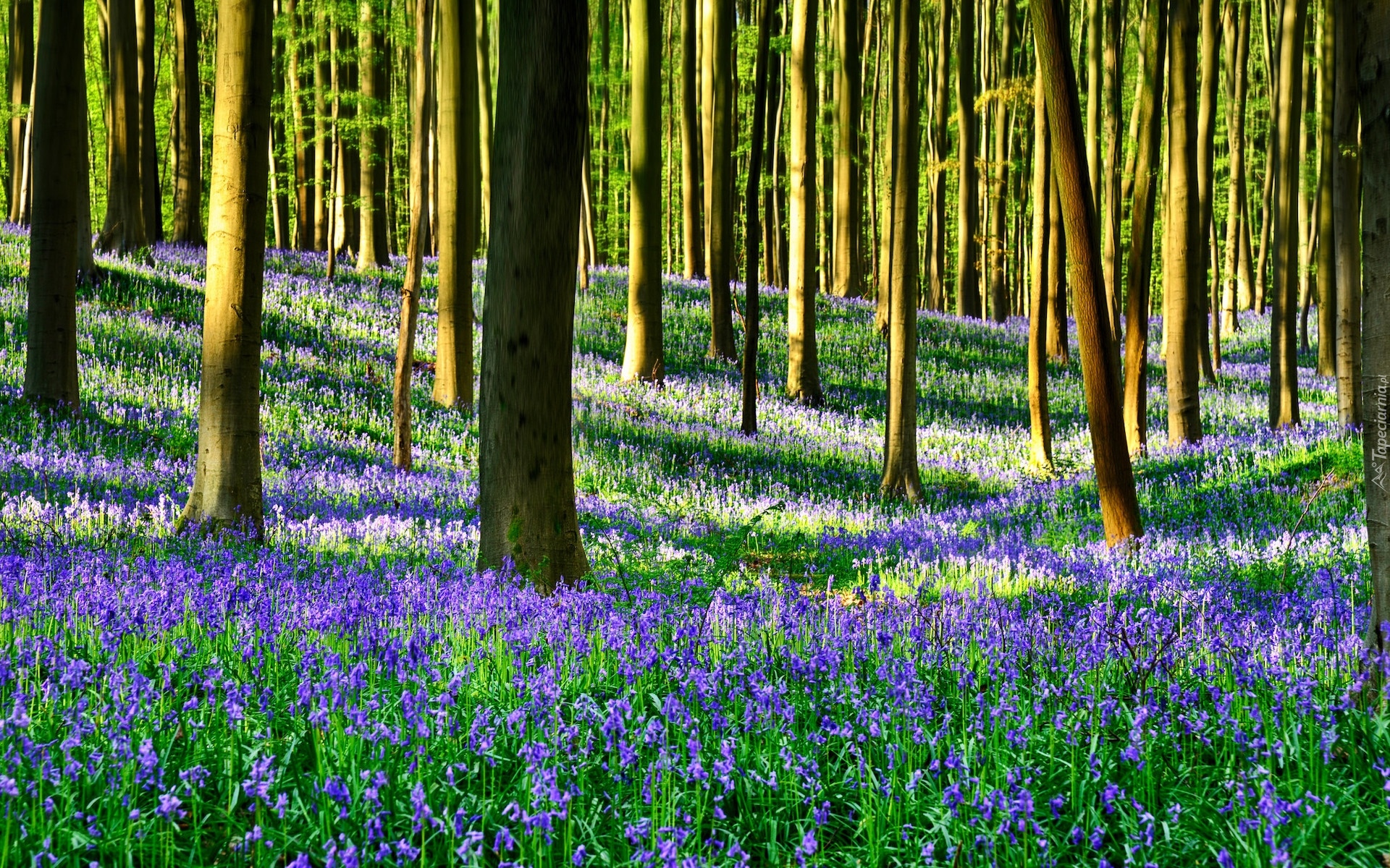 Edytor tapety: Dzwonki pod drzewami w słonecznym lesie