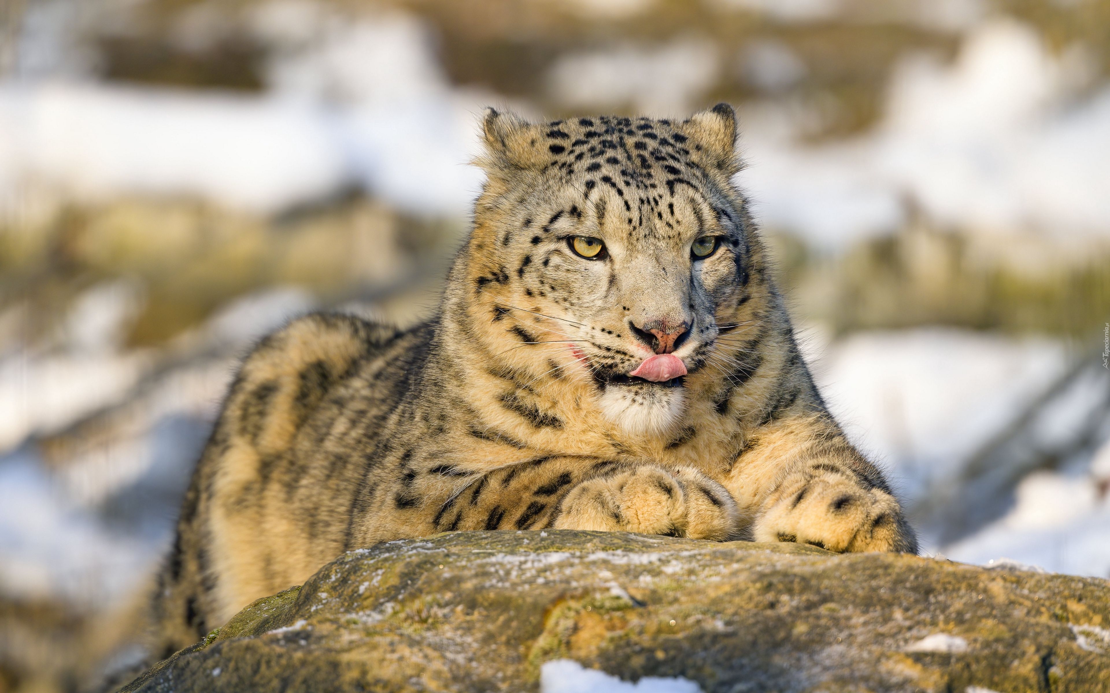 Edytor tapety: Irbis leżący na skale