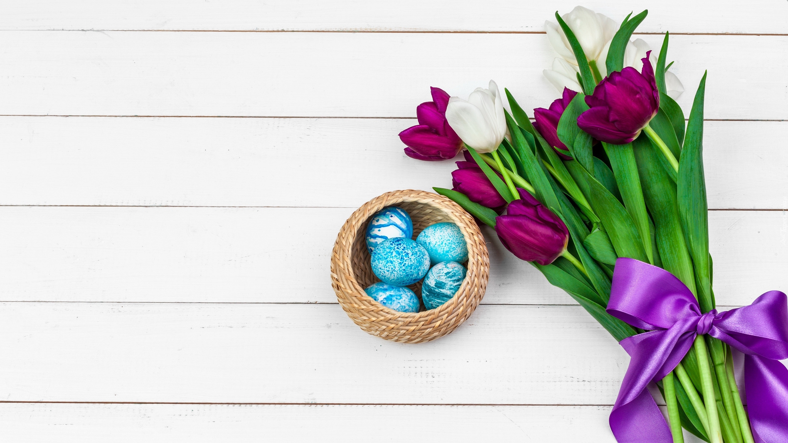 Edytor tapety: Pisanki w koszyku obok tulipanów przewiązanych wstążką