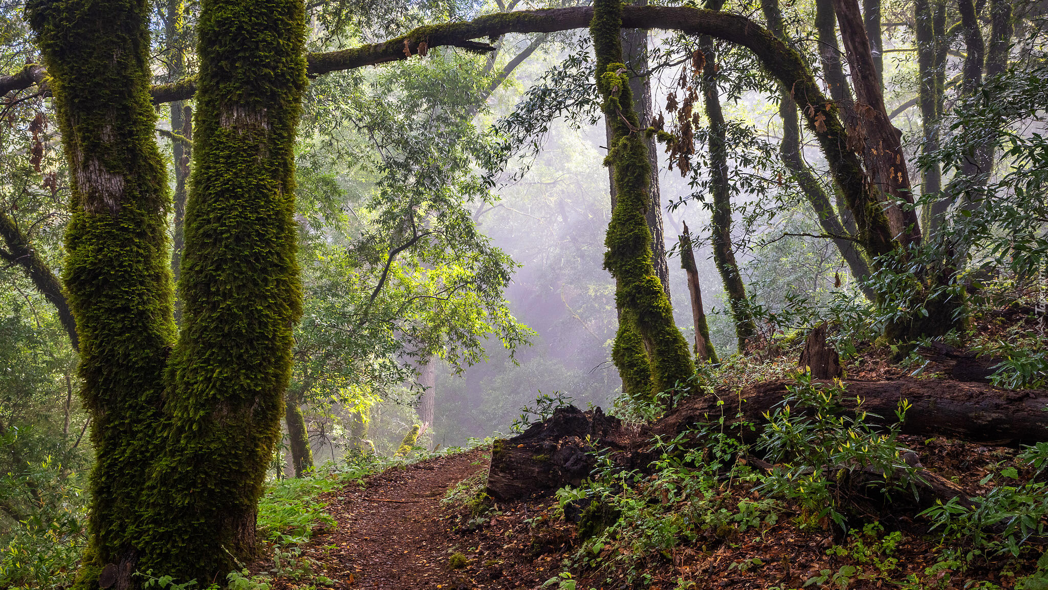 Edytor tapety: Omszałe drzewa przy ścieżce w zamglonym lesie