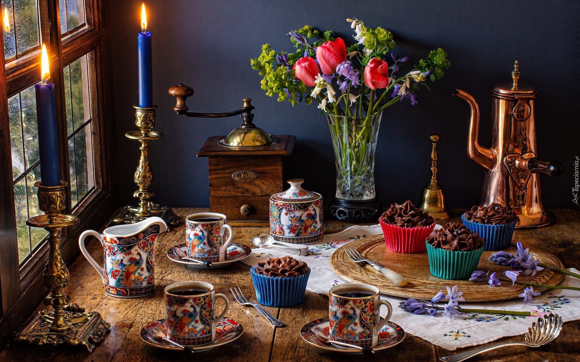 Edytor tapety: Serwis kawowy i zapalone świece przy oknie