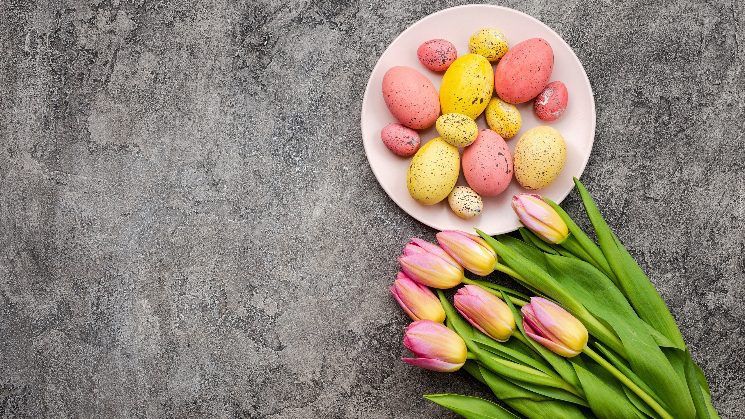 Edytor tapety: Żółto-różowe tulipany obok pisanek na talerzu