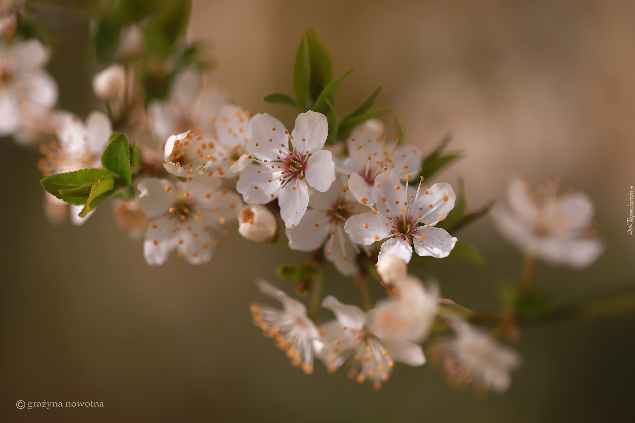 Edytor tapety: Białe kwiaty i liście na gałązce drzewa owocowego
