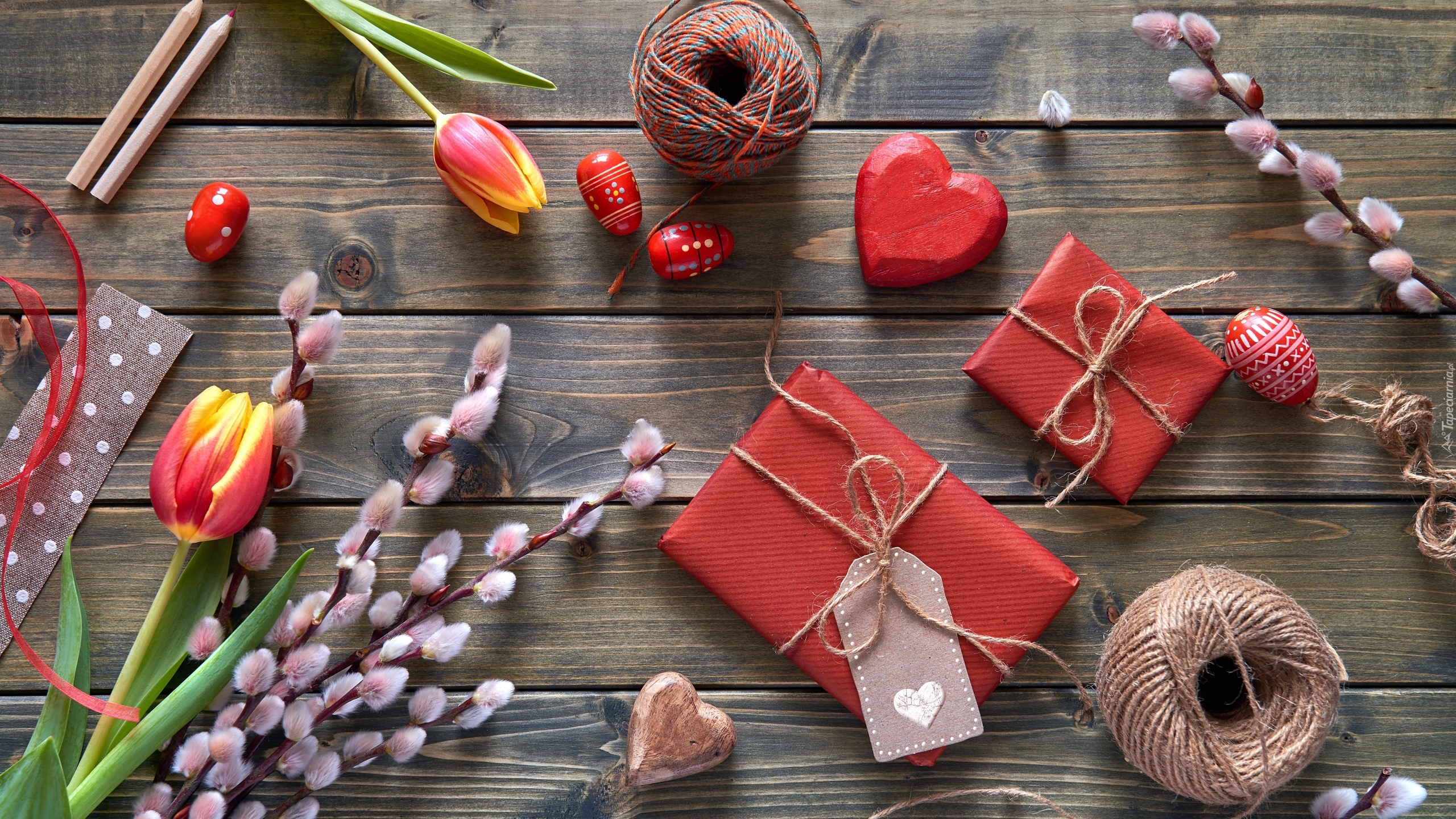 Edytor tapety: Bazie i tulipany obok prezentów na deskach