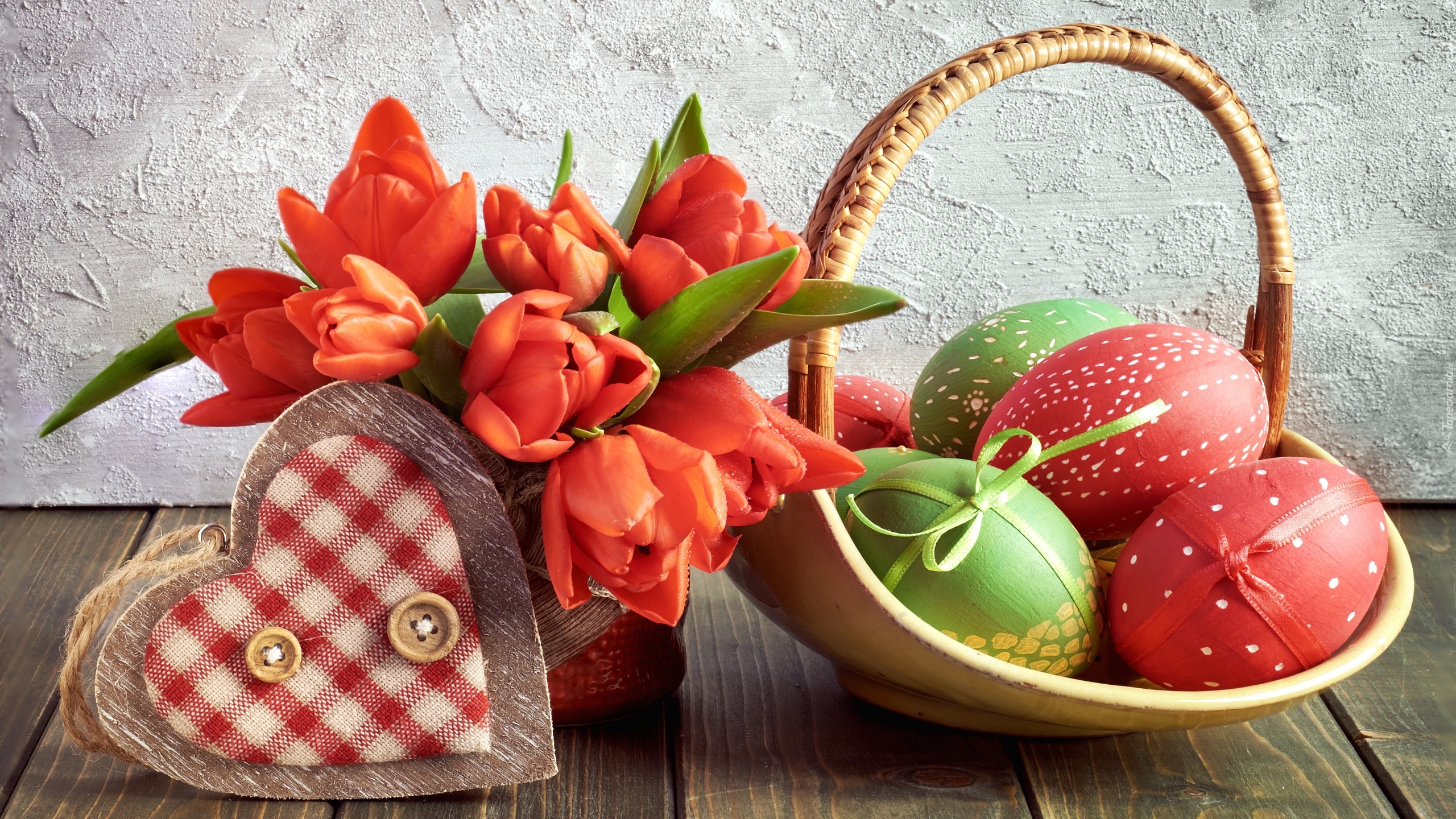 Edytor tapety: Serce obok tulipanów i pisanek w koszyku