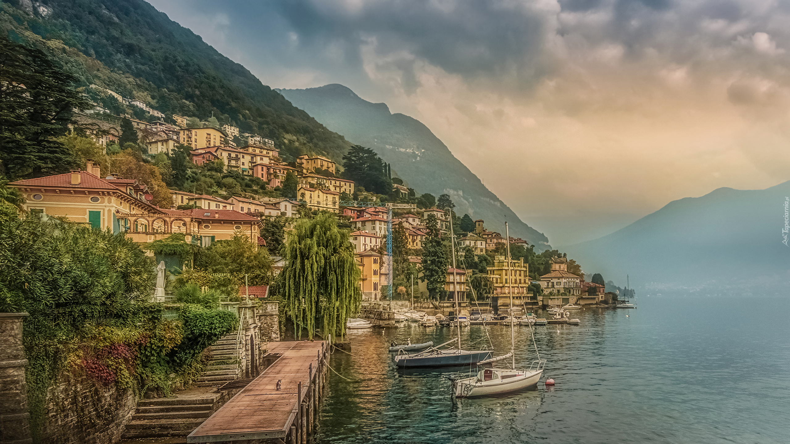 Edytor tapety: Moltrasio nad zamglonym jeziorem Como