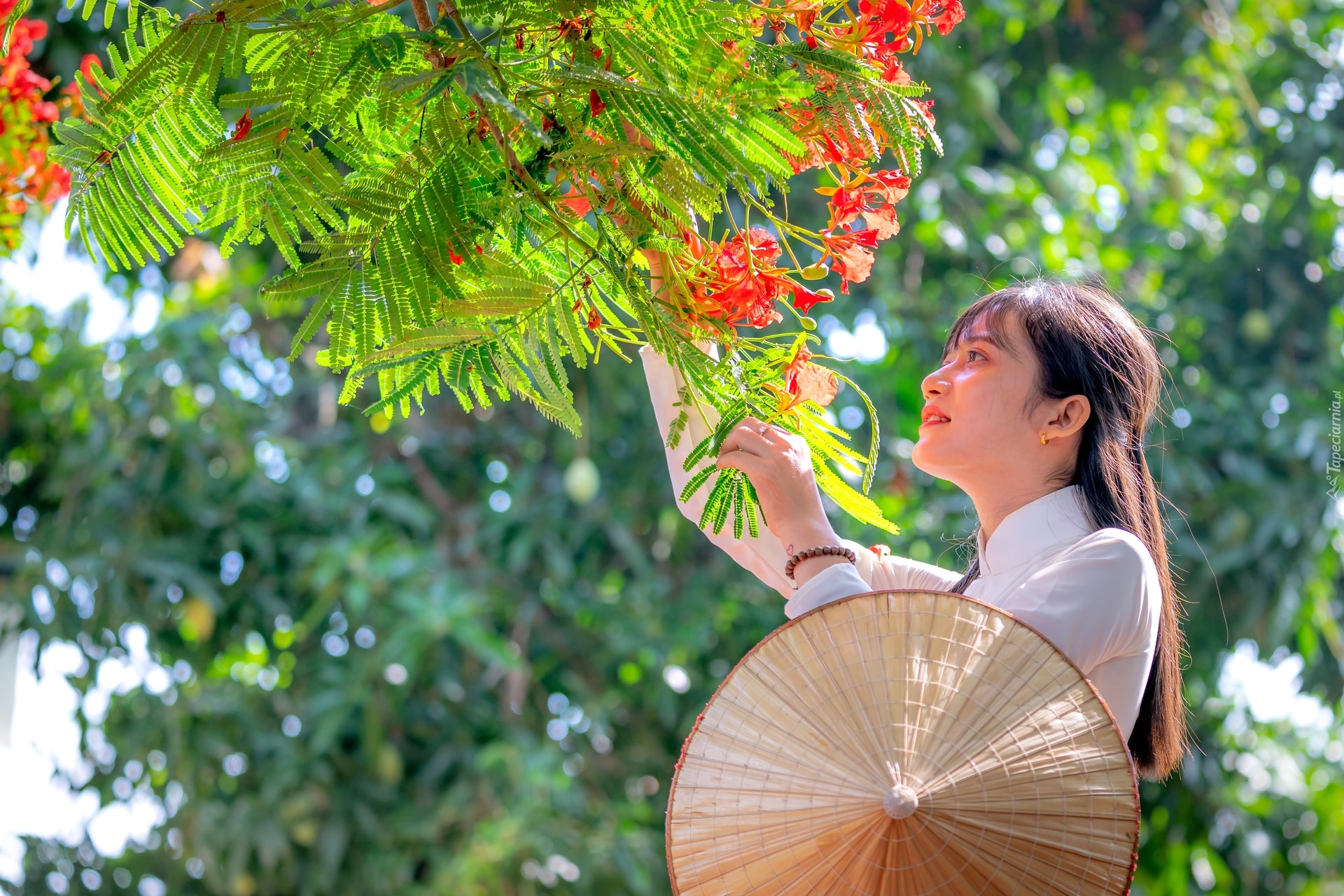 Edytor tapety: Azjatka z kapeluszem pod ukwieconym drzewem
