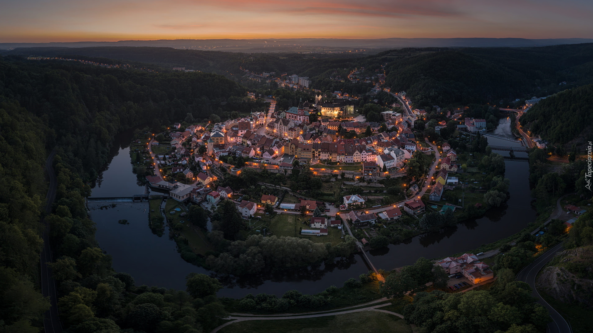Edytor tapety: Oświetlone miasto Loket w Czechach