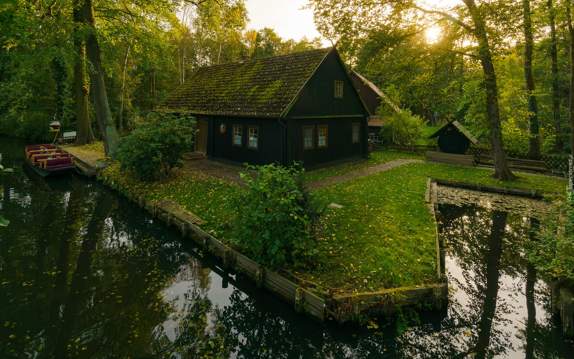 Edytor tapety: Dom i zielone drzewa nad kanałem