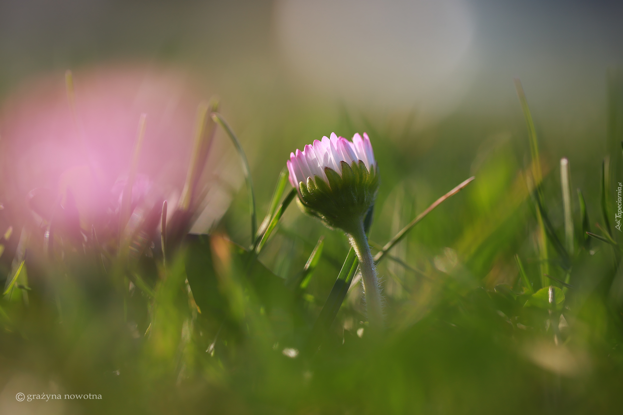 Edytor tapety: Różowa stokrotka w trawie