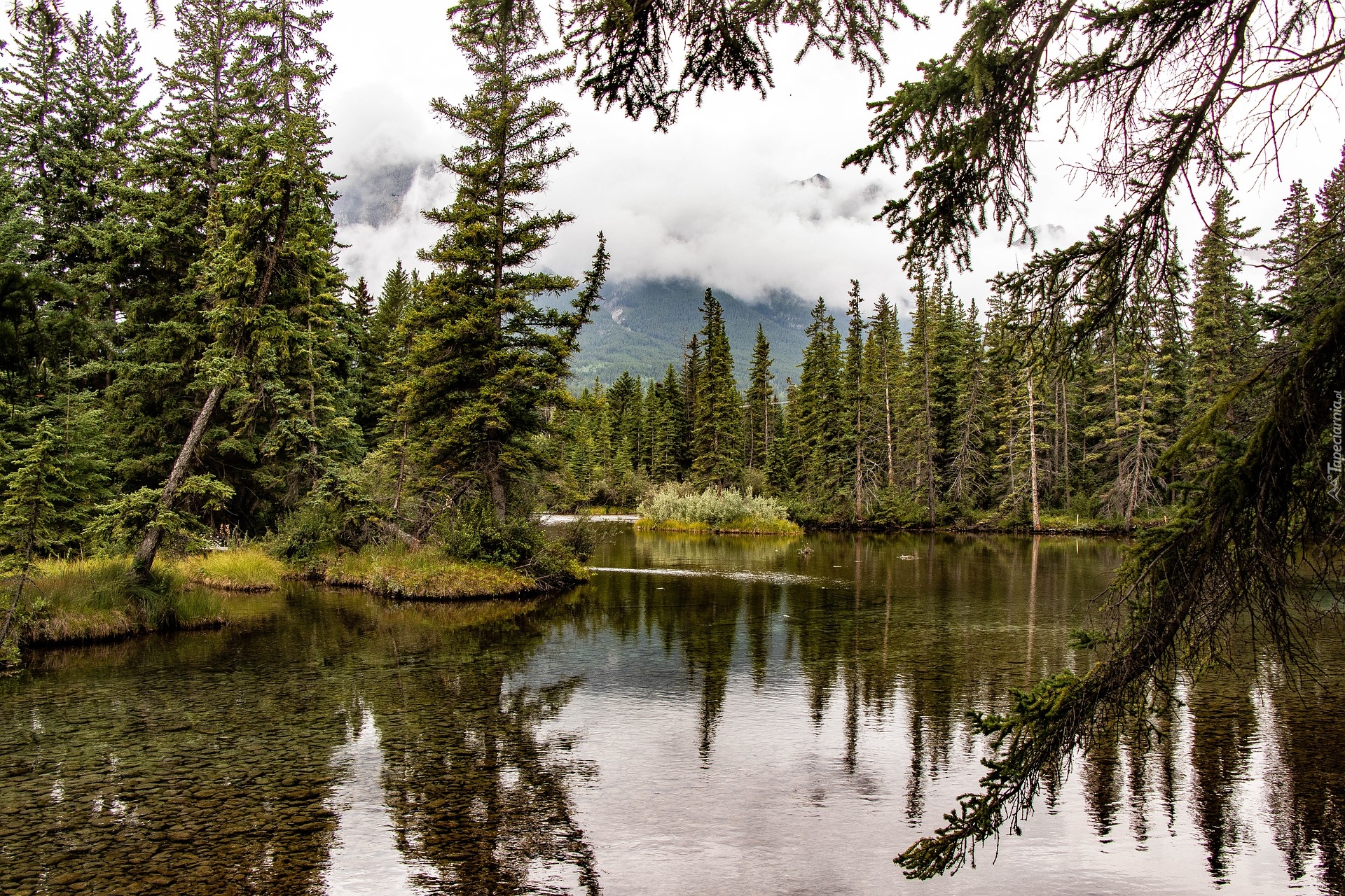 Edytor tapety: Las iglasty nad jeziorem i mgła nad górami