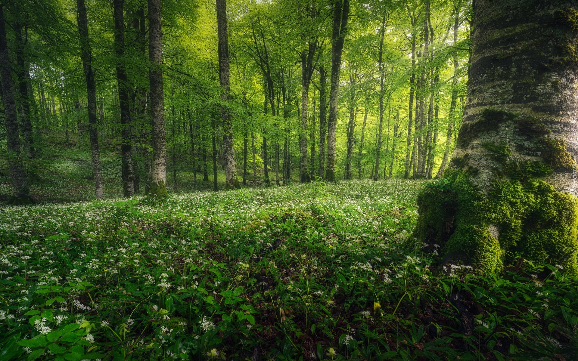 Edytor tapety: Czosnek niedźwiedzi pod drzewami w lesie