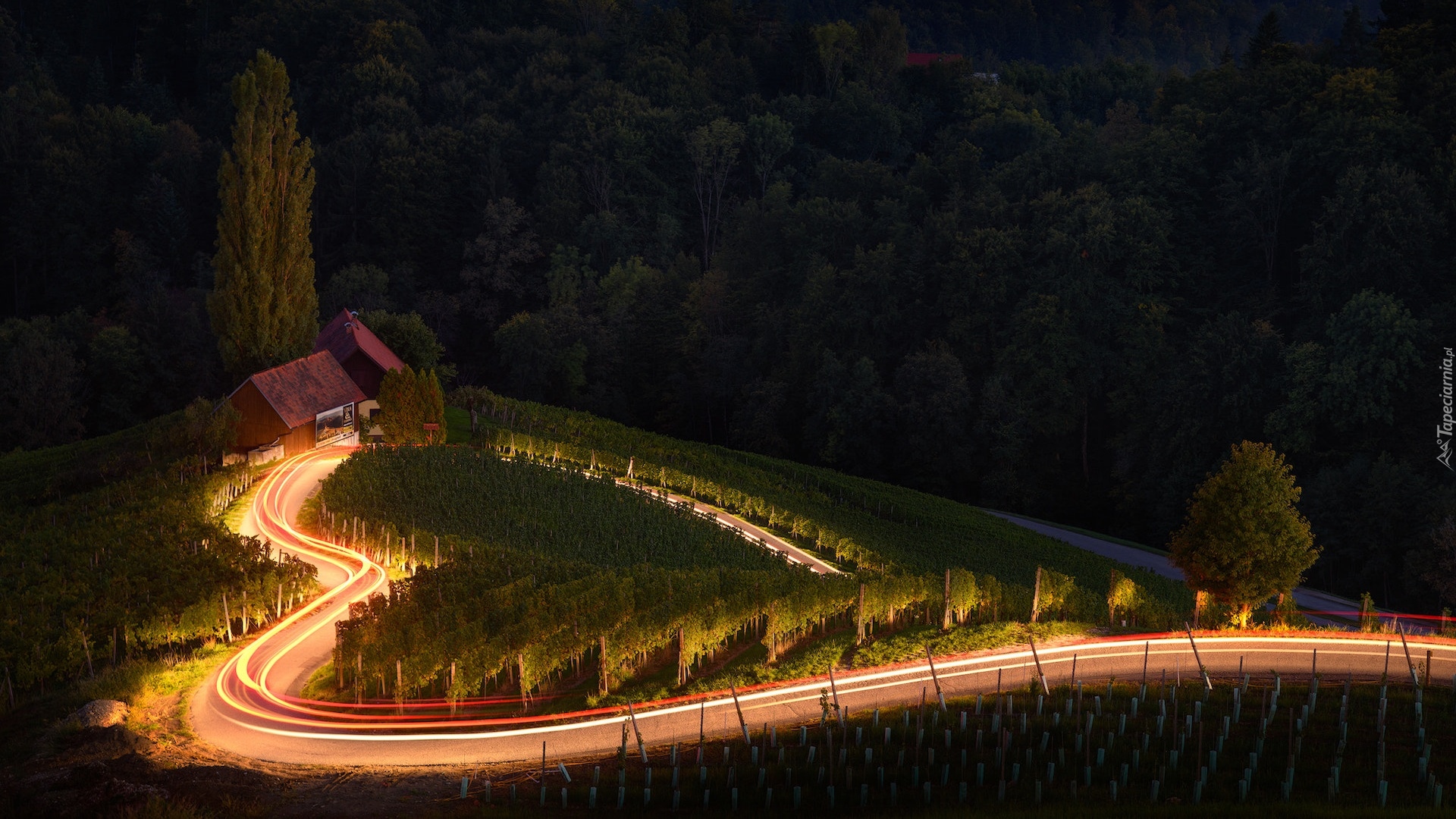 Edytor tapety: Oświetlona droga wśród winnic we wsi Spicnik