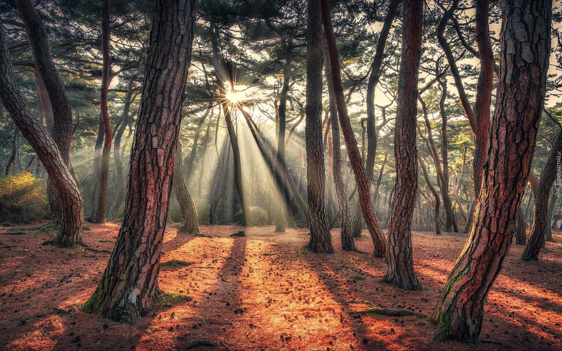 Edytor tapety: Promienie słońca pomiędzy sosnami w lesie