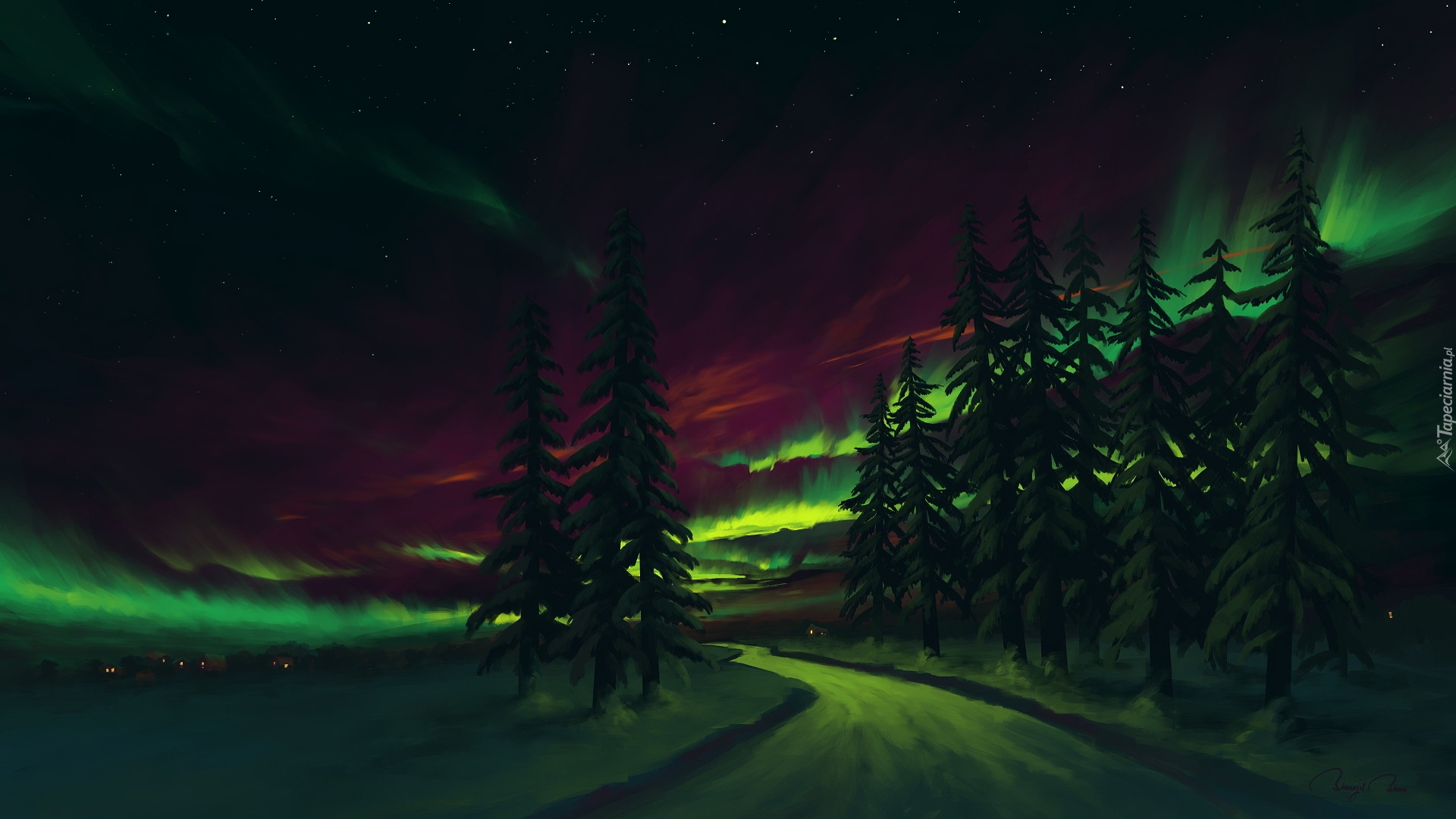 Edytor tapety: Drzewa na tle zorzy polarnej
