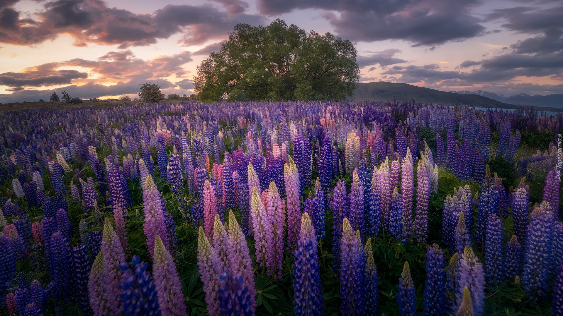 Edytor tapety: Drzewo i kolorowe łubiny na łące