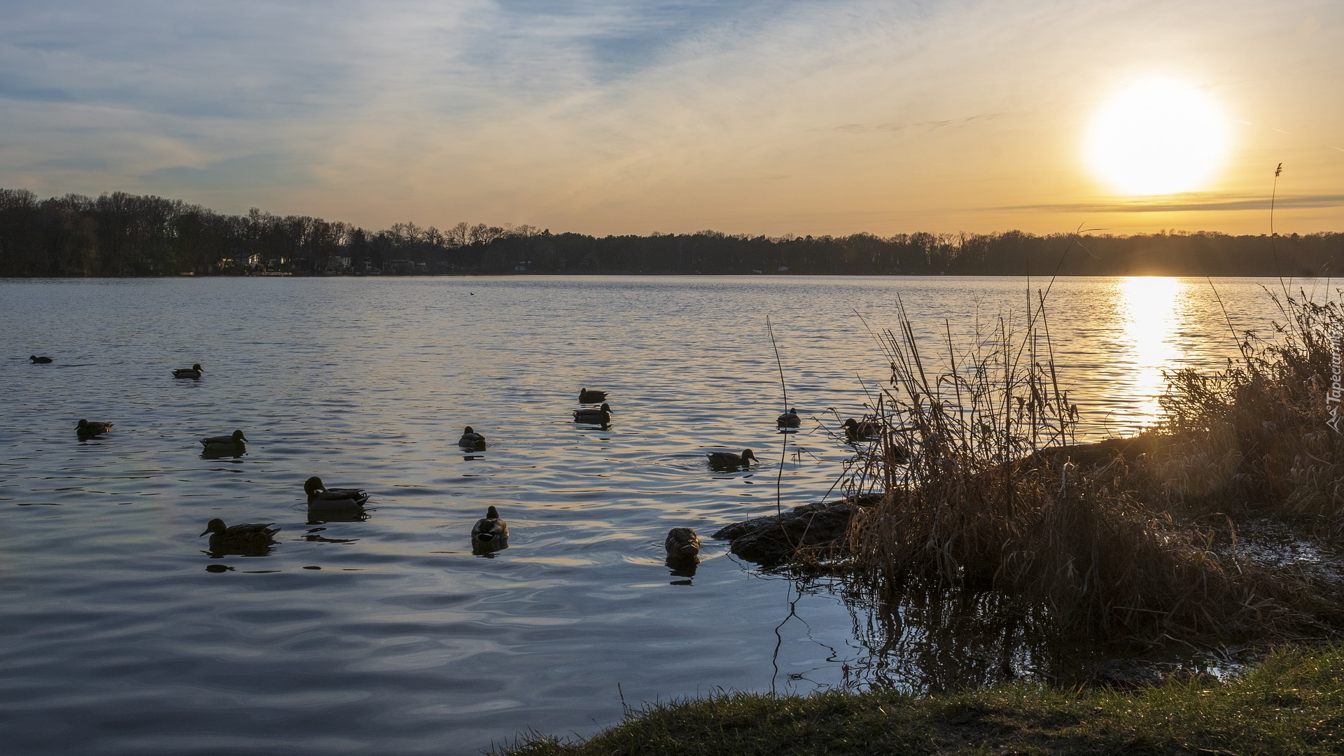 Edytor tapety: Kaczki na jeziorze o zachodzie słońca