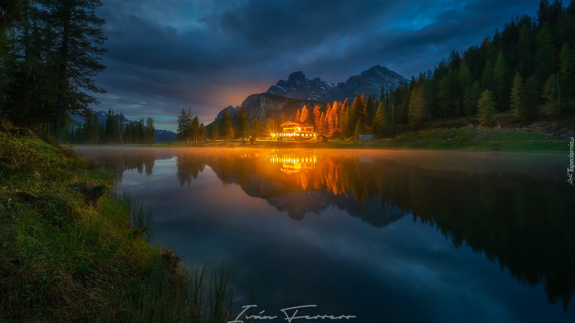 Edytor tapety: Oświetlony dom nad jeziorem Antorno Lake w Dolomitach