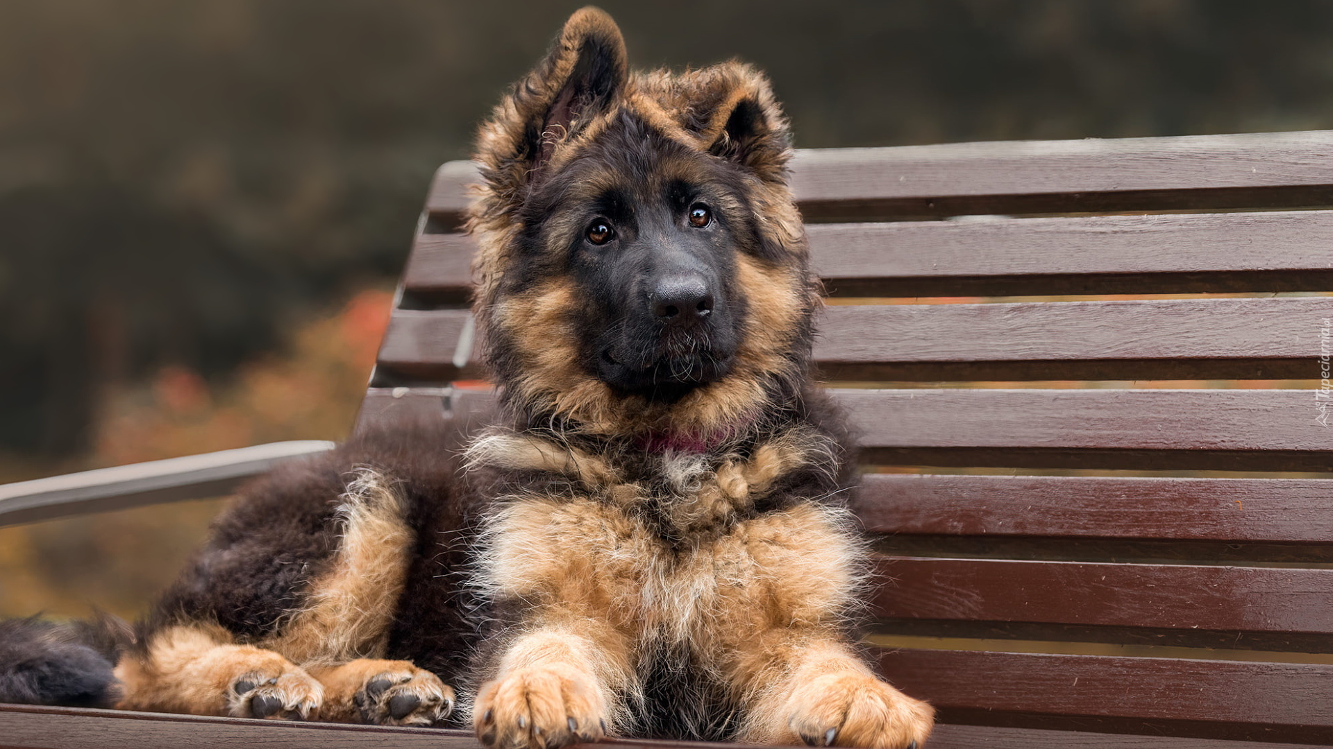 Edytor tapety: Szczeniak owczarka niemieckiego długowłosego na ławce