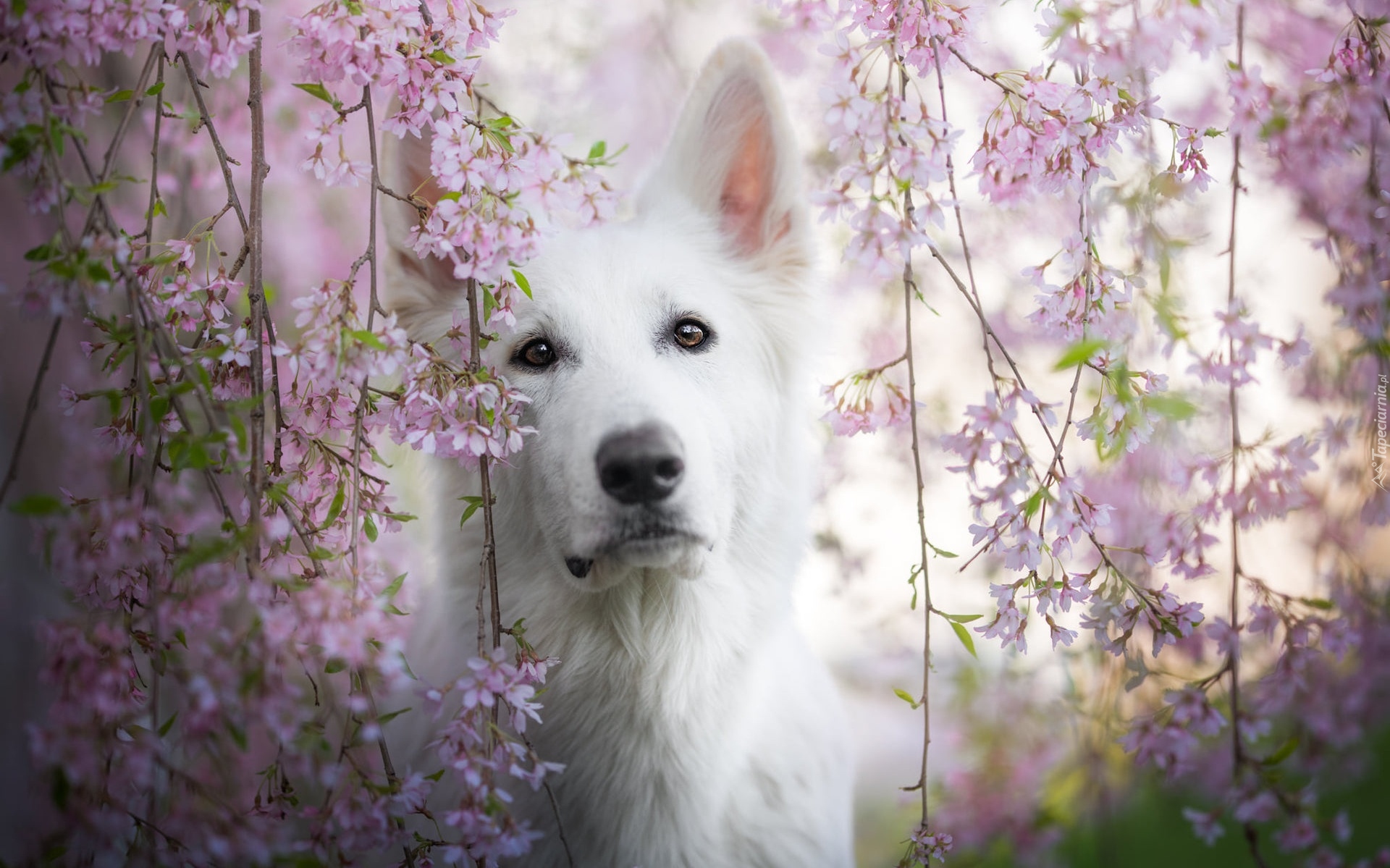 Edytor tapety: Biały owczarek szwajcarski pod ukwieconymi gałązkami