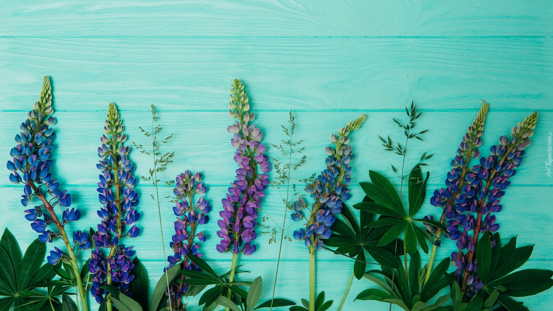 Edytor tapety: Łubiny ułożone na zielonych deskach