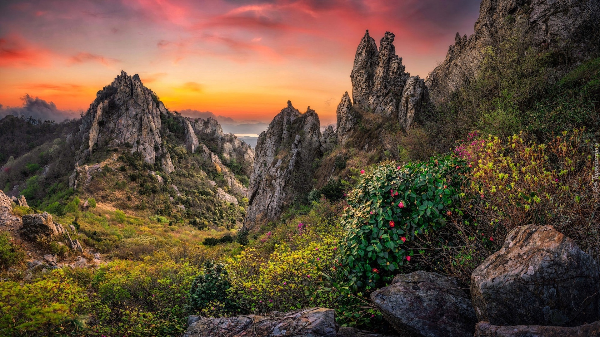 Edytor tapety: Skały i roślinność na tle zachodzącego słońca