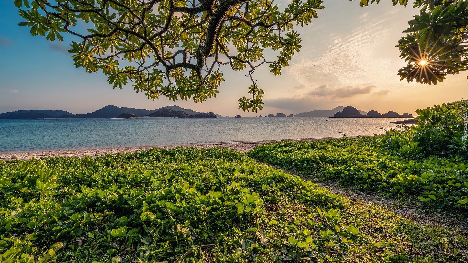 Edytor tapety: Rozświetlone słońcem drzewo i rośliny nad morzem