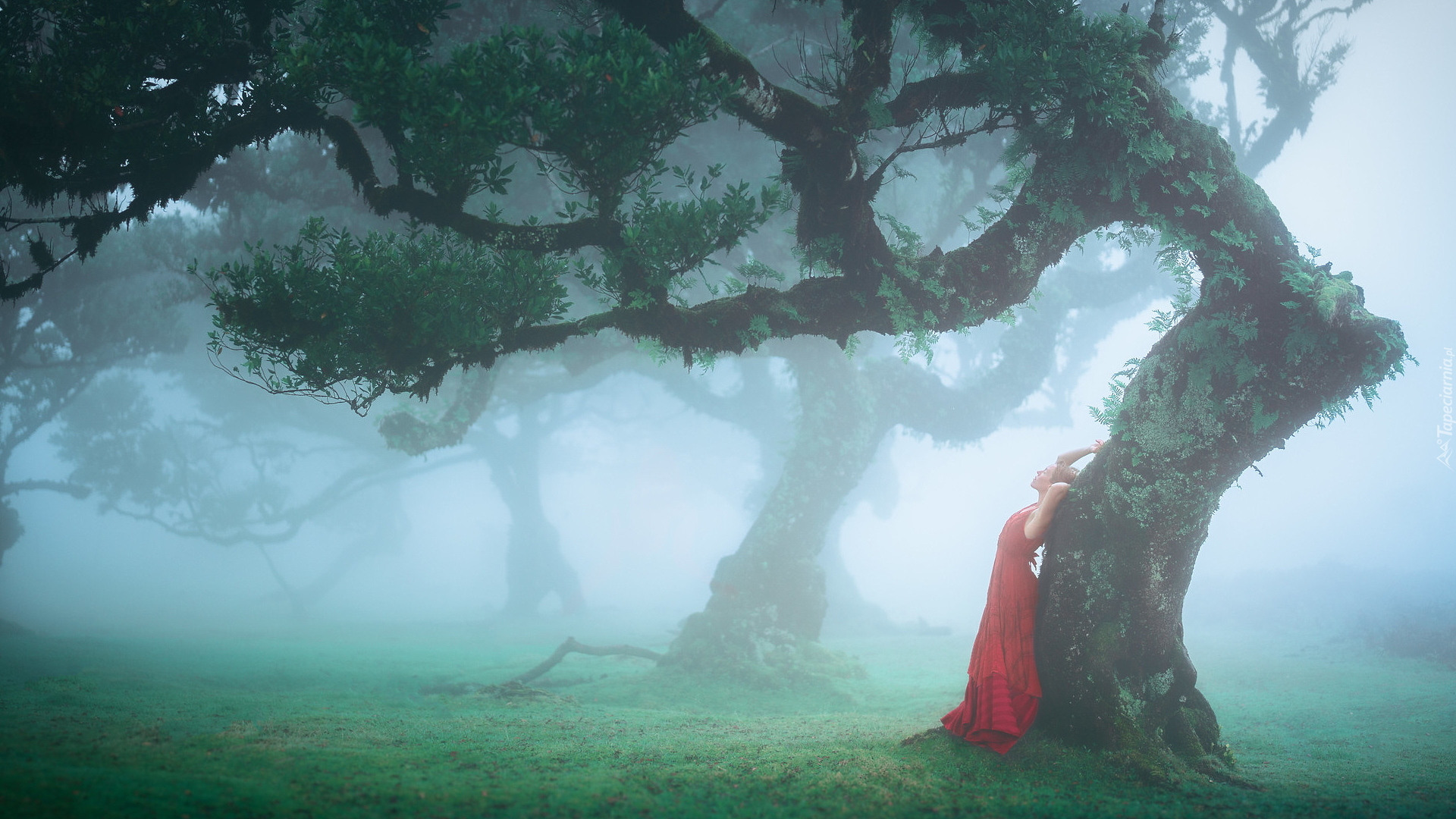 Edytor tapety: Kobieta w czerwonej sukience pod drzewem