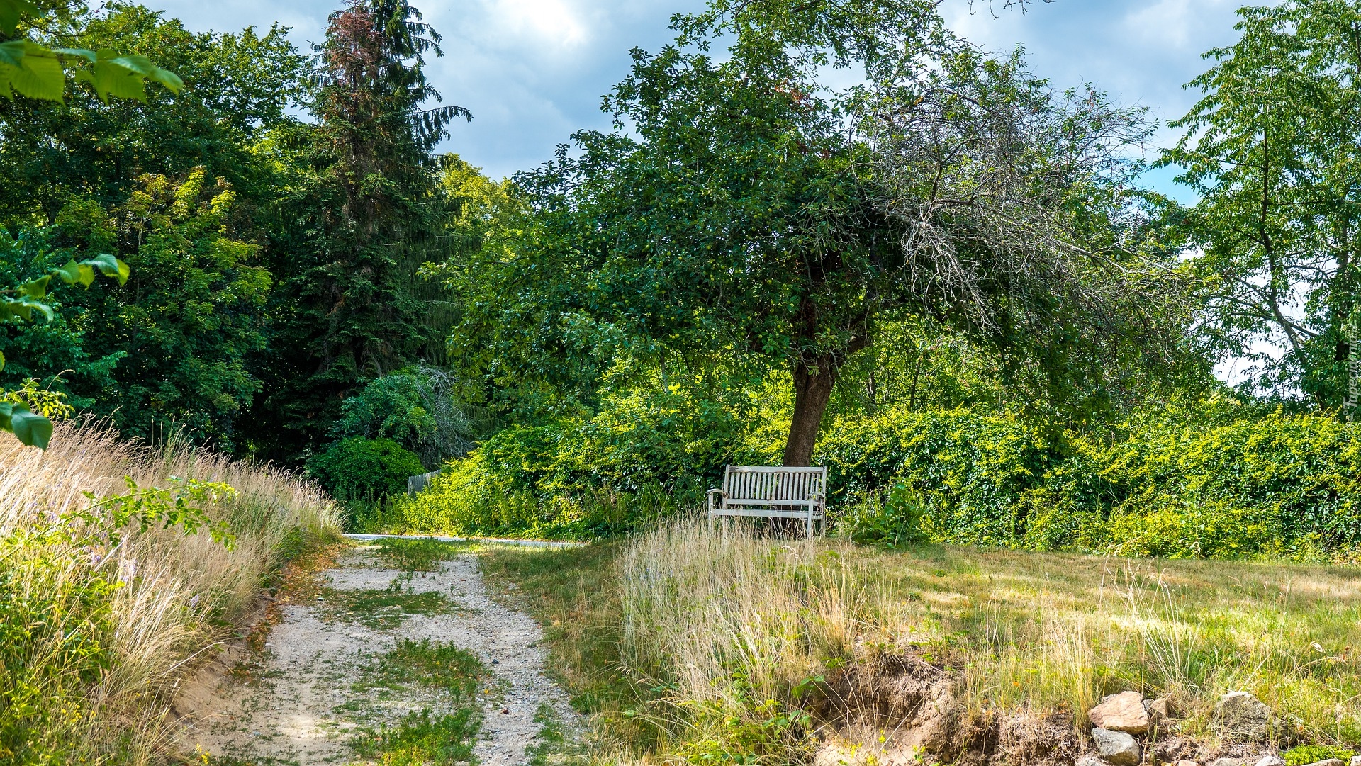 Edytor tapety: Ławka pod jabłonią przy polnej drodze
