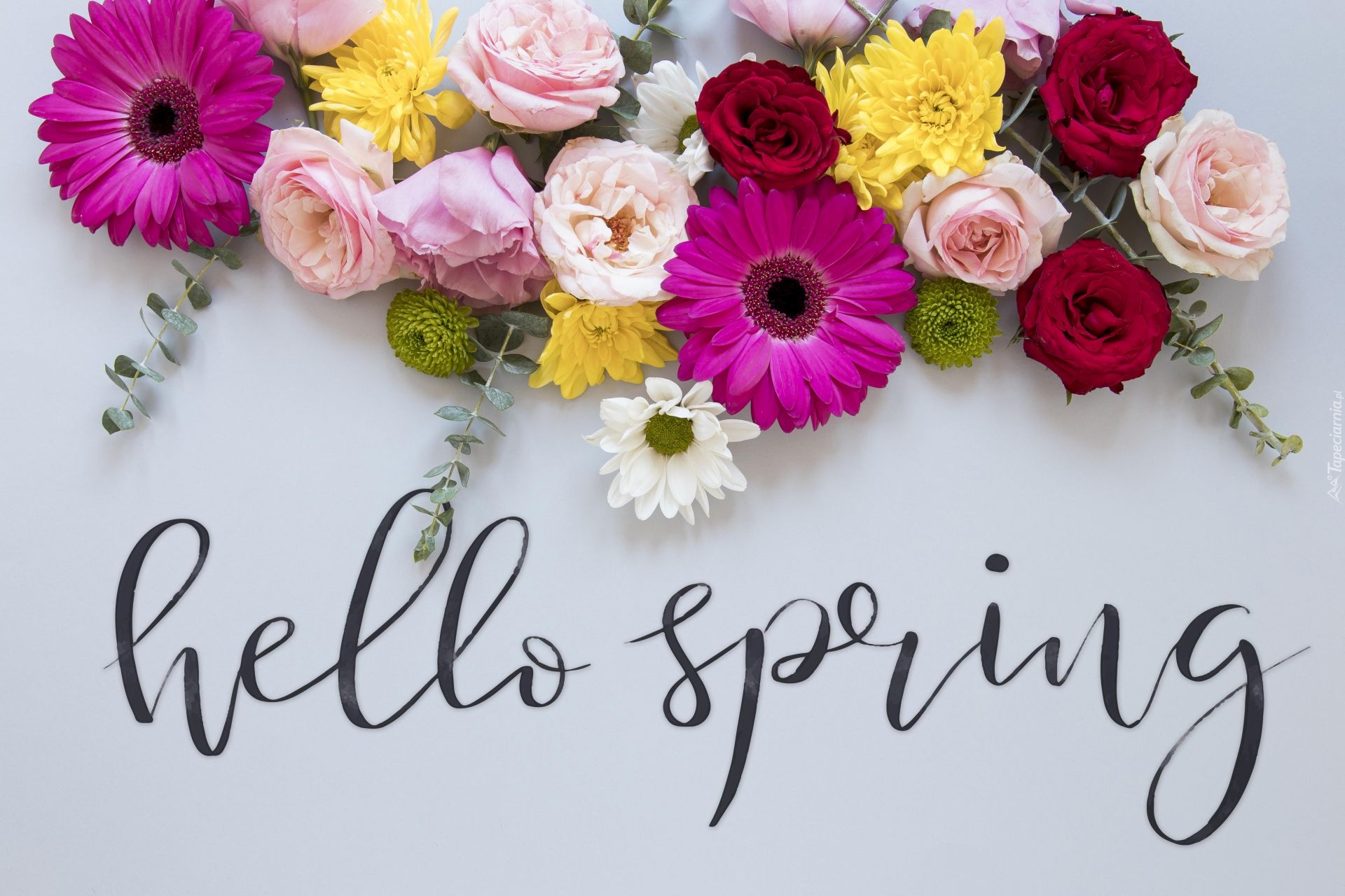 Edytor tapety: Napis Hello spring pod różnorodnymi kwiatami