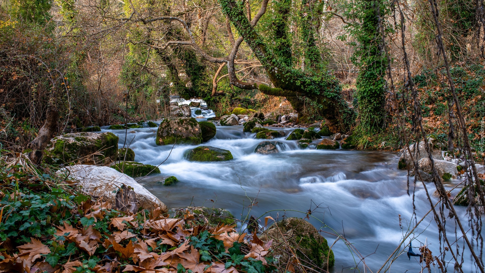 Edytor tapety: Drzewa porośnięte bluszczem nad rzeką