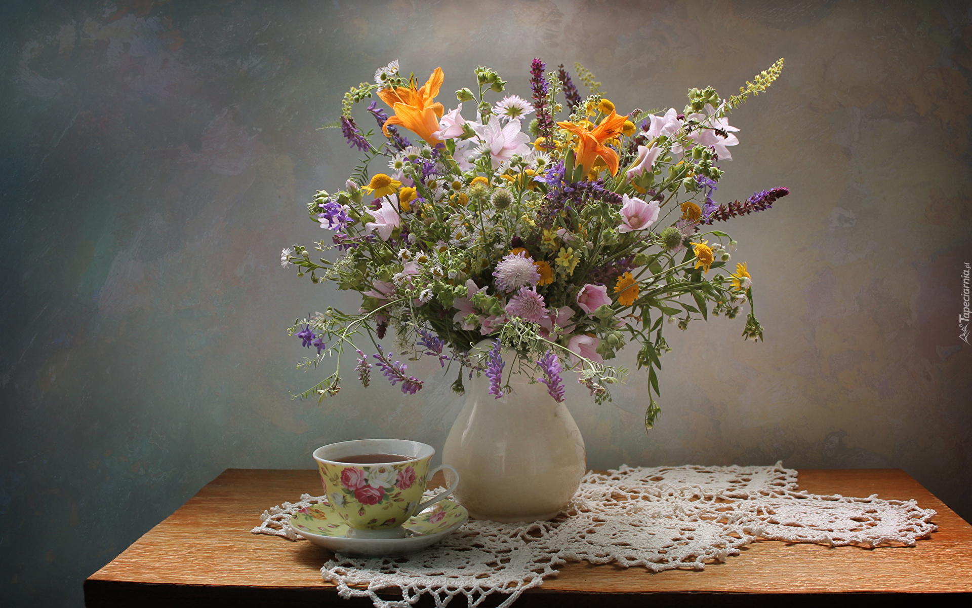 Edytor tapety: Bukiet polnych kwiatów w wazonie obok filiżanki herbaty