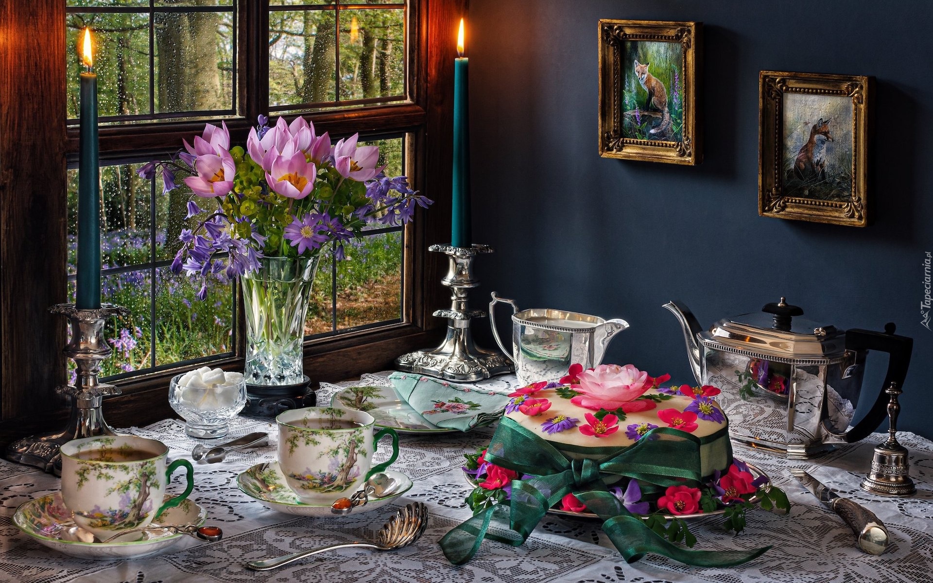 Edytor tapety: Bukiet kwiatów obok serwisu kawowego i tortu