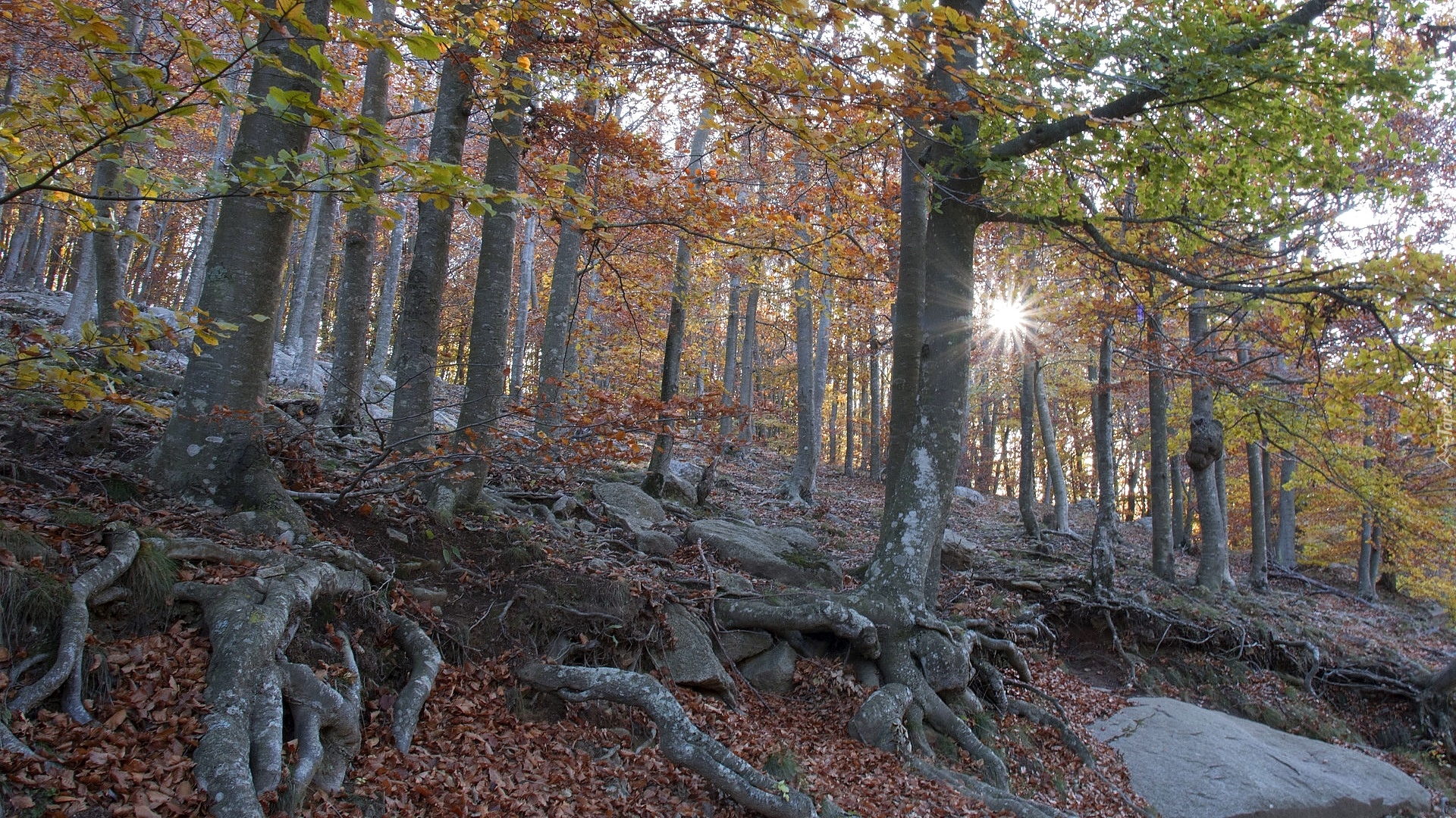 Edytor tapety: Kamienie i opadłe liście w jesiennym lesie