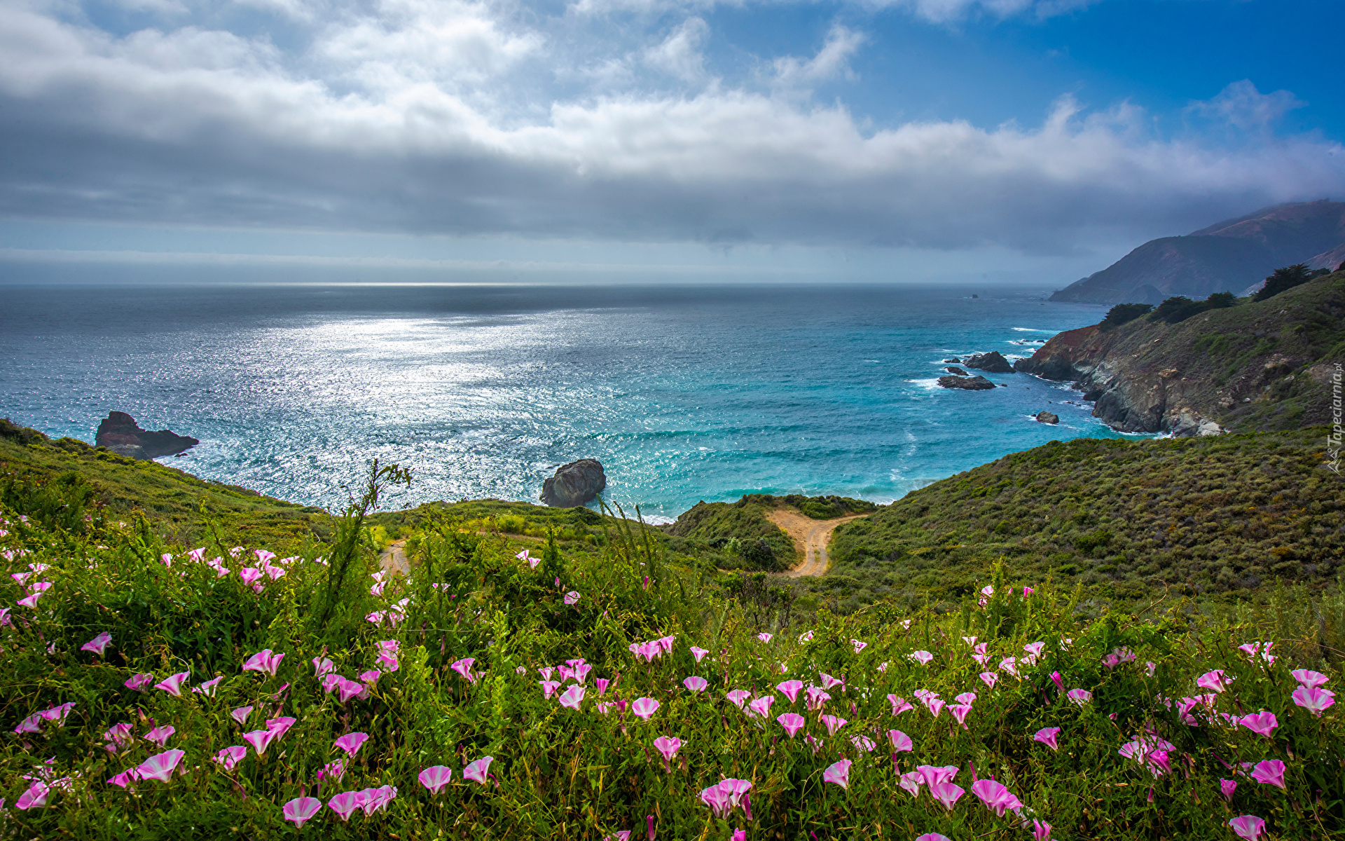 Edytor tapety: Kwiaty na wzgórzu z widokiem na ocean