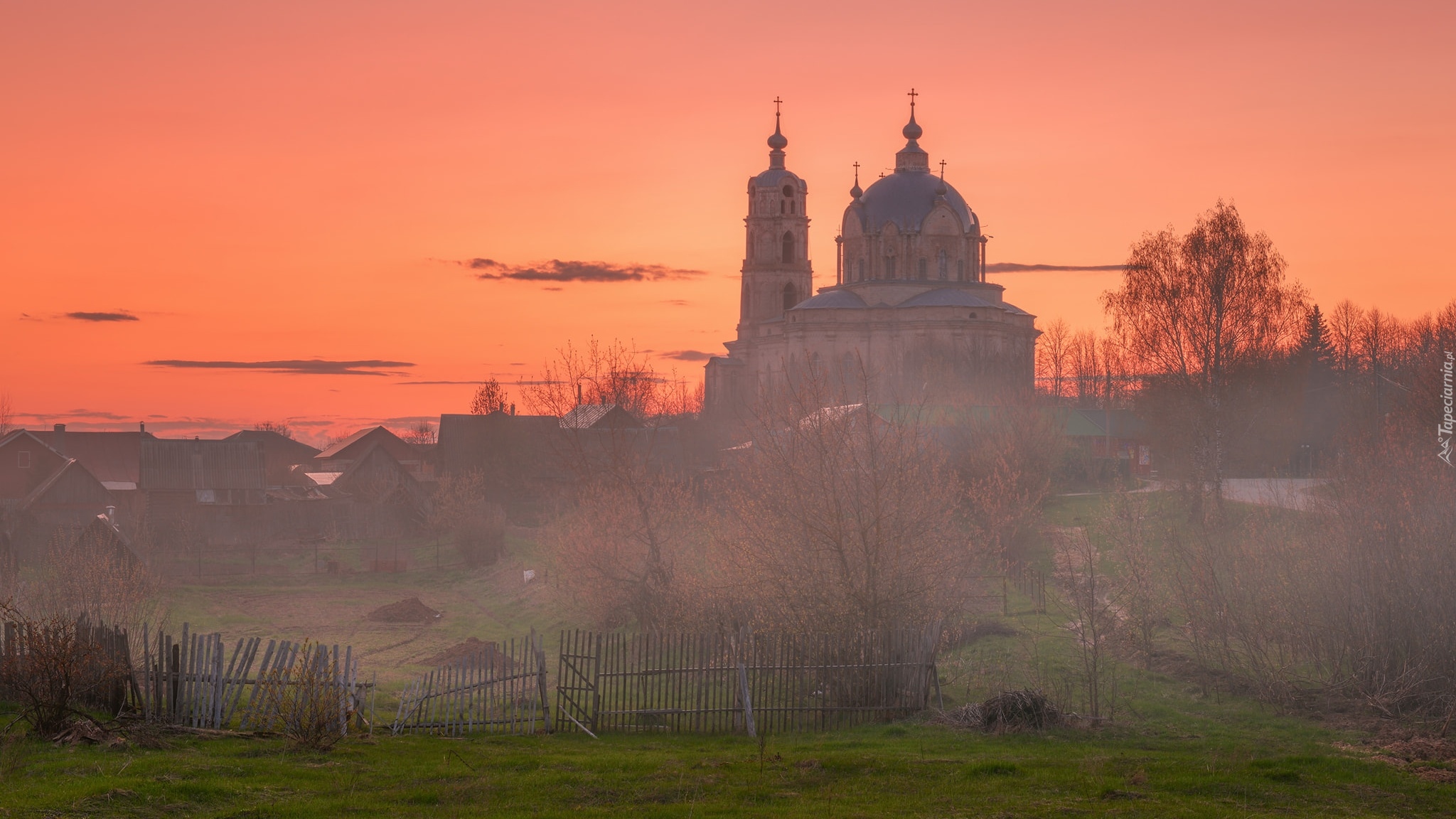 Edytor tapety: Cerkiew i domy we wsi pod kolorowym niebem