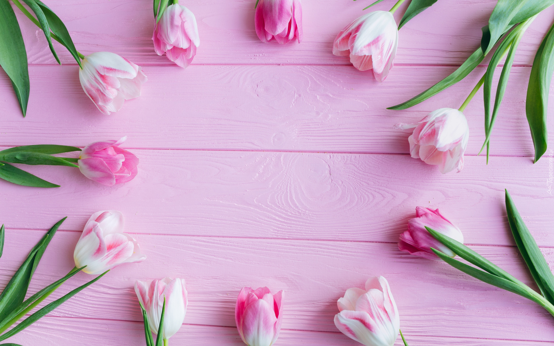 Edytor tapety: Biało-różowe tulipany ułożone na różowych deskach