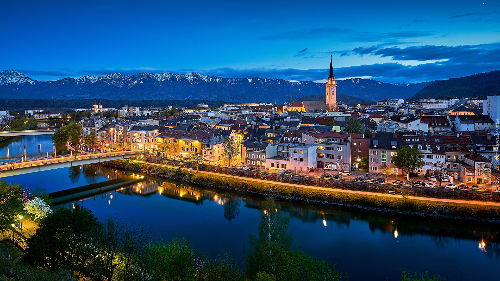 Edytor tapety: Rzeka Drawa w mieście Villach wieczorową porą