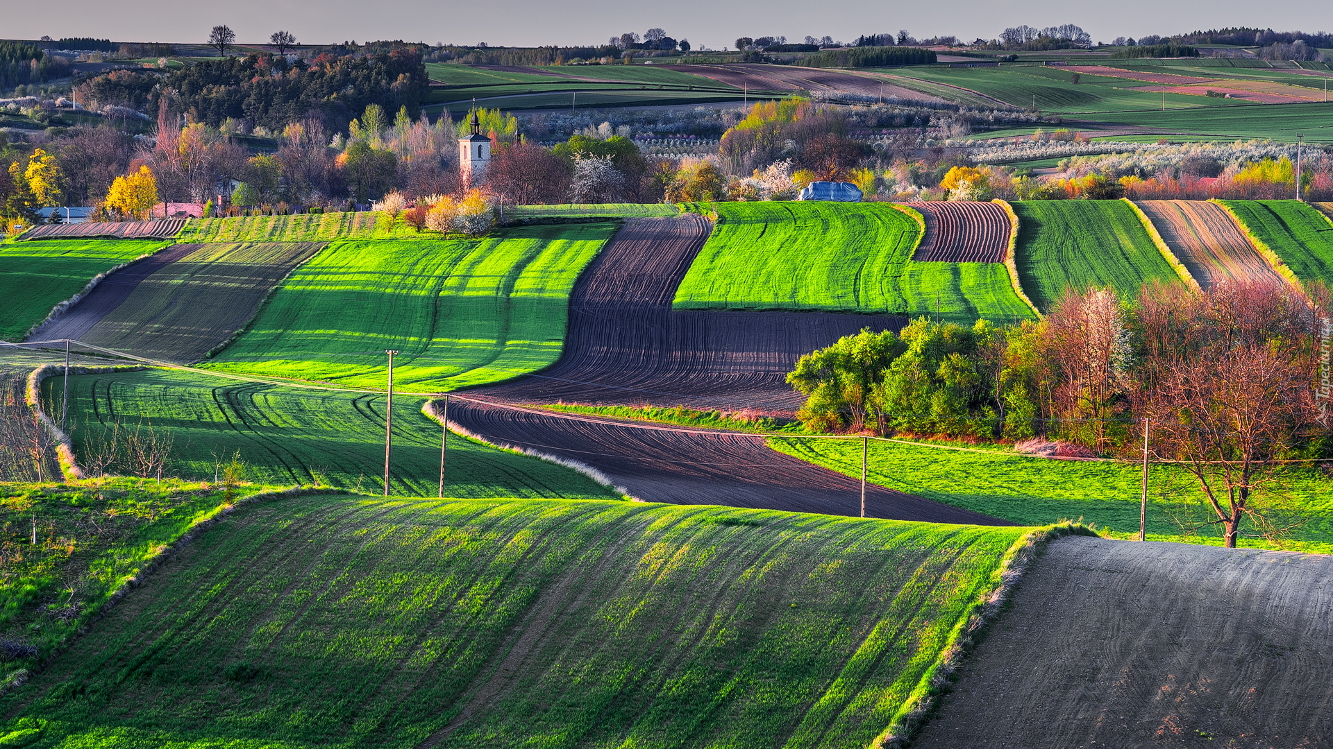 Edytor tapety: Kościół pośród pól i kwitnących drzew na Ponidziu