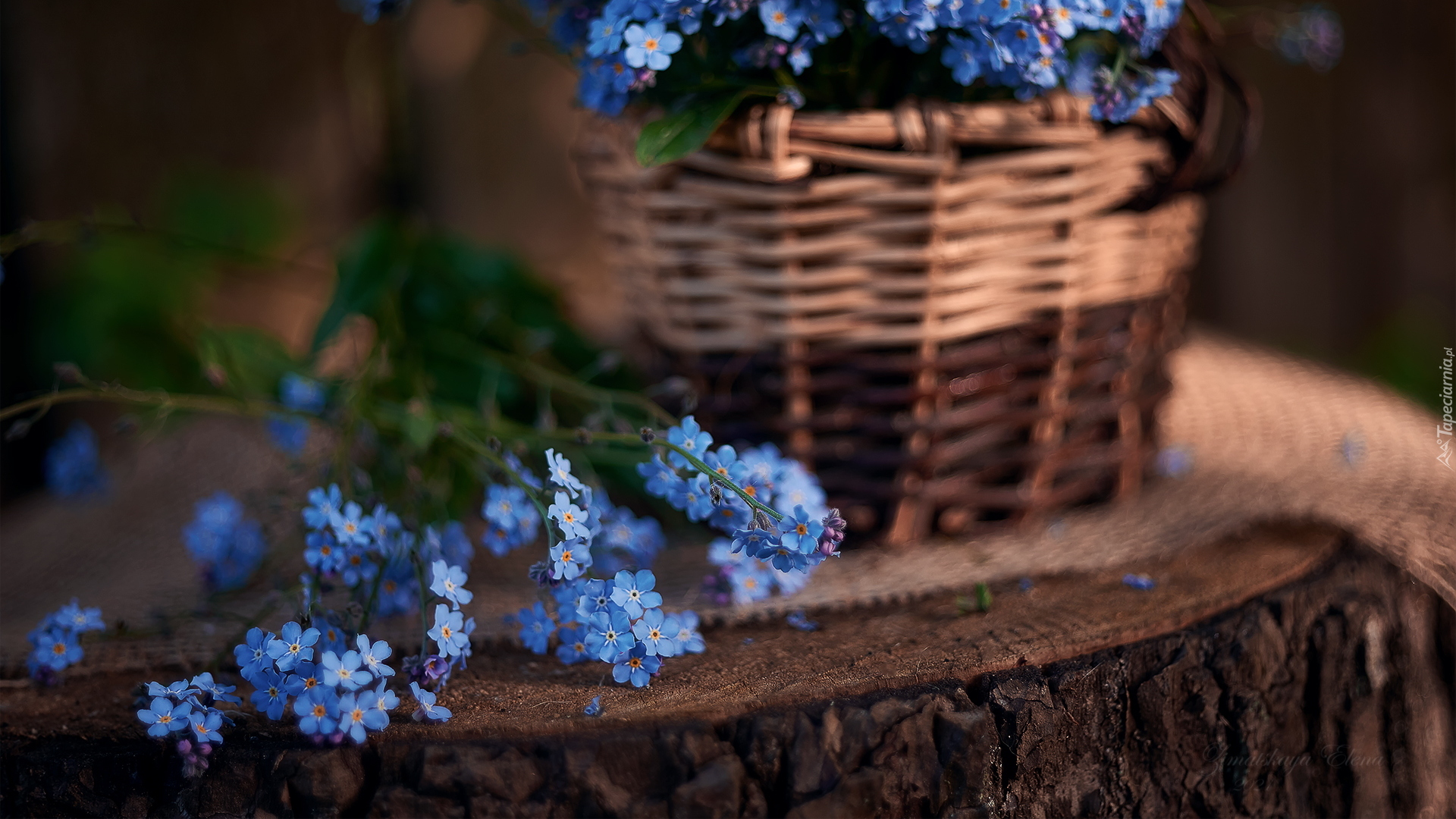 Edytor tapety: Niezapominajki na pniu i w koszyku