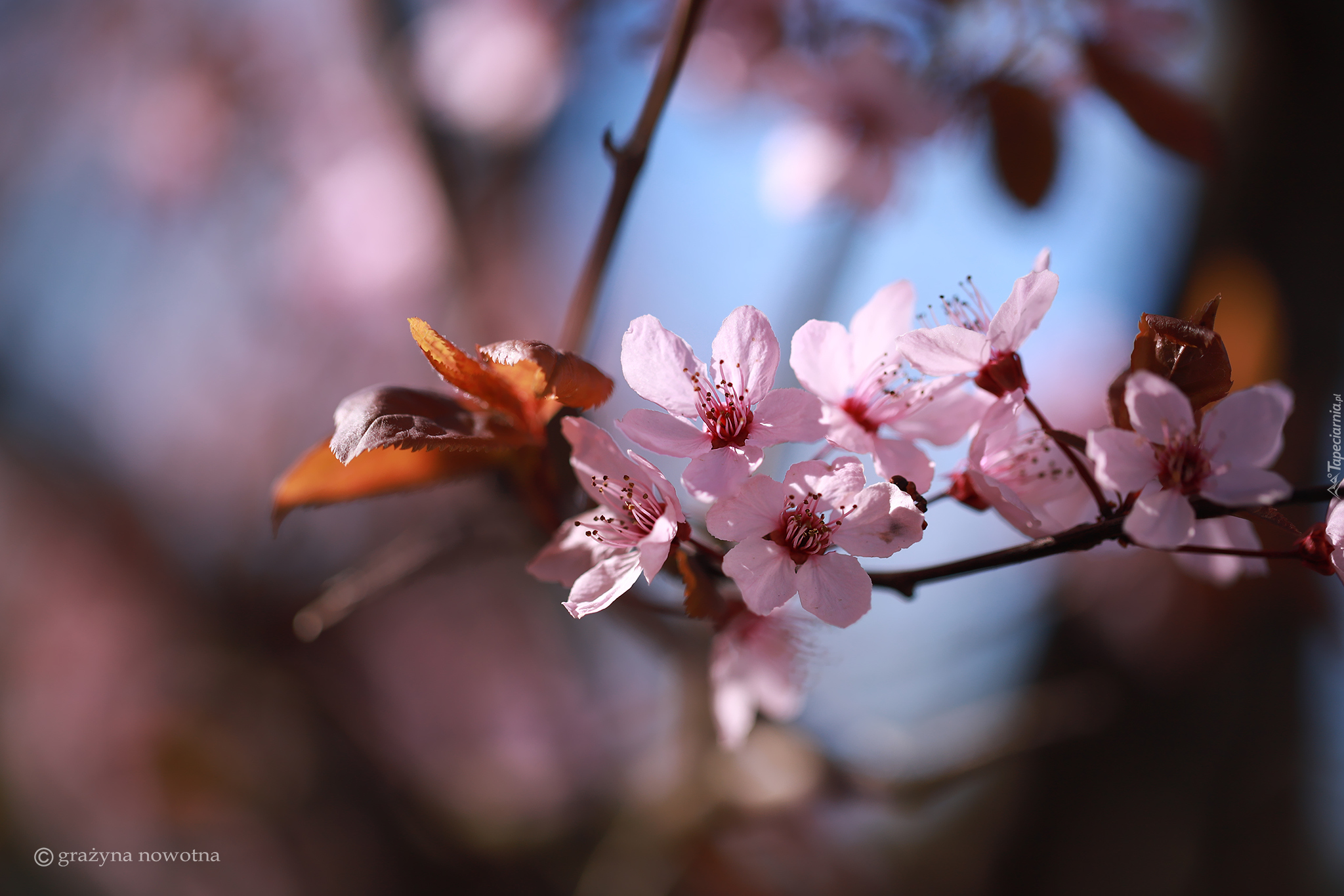 Edytor tapety: Brązowe liście i różowe kwiaty na gałązce