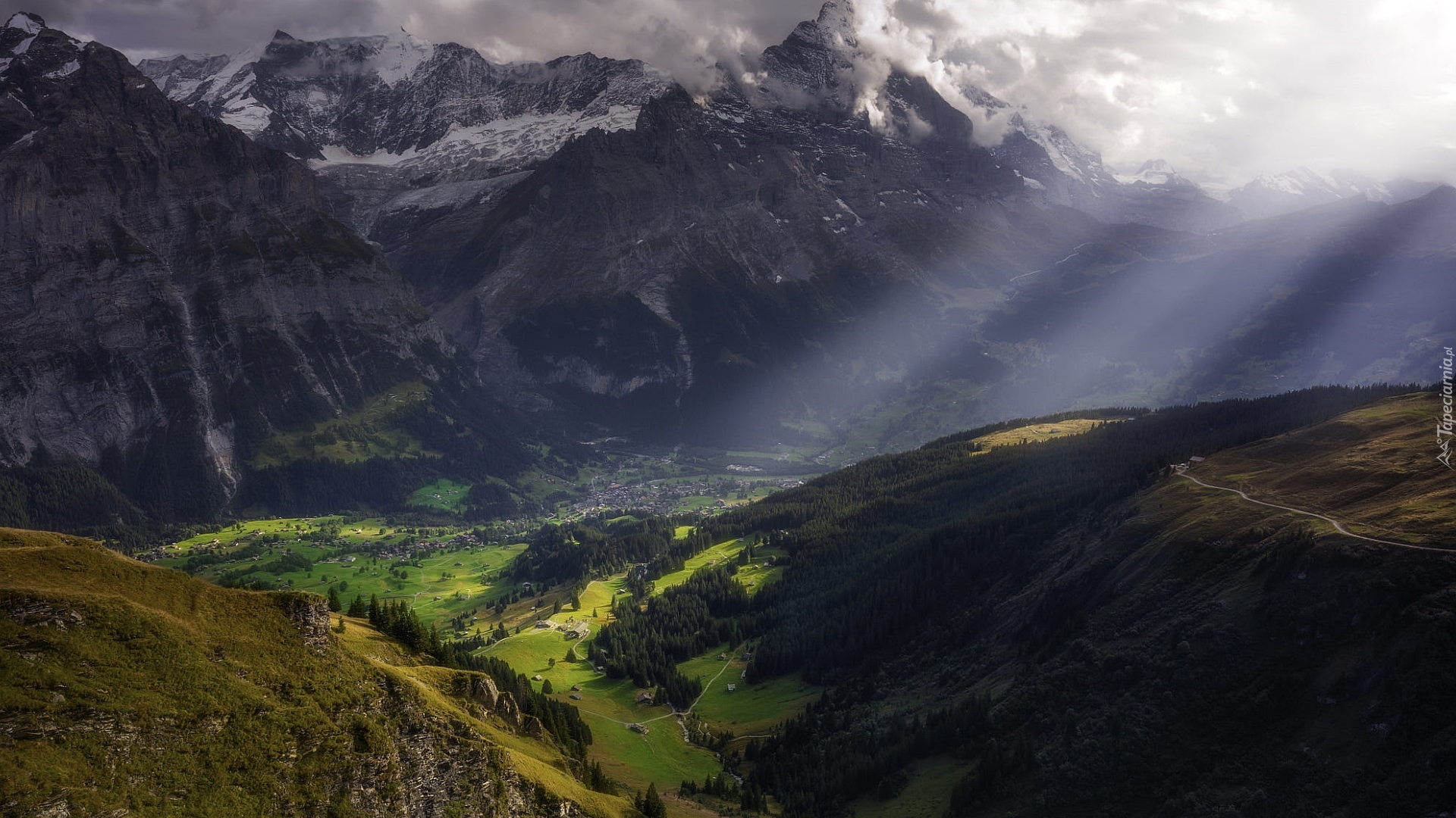 Edytor tapety: Rozświetlona słońcem wioska w dolinie Grindelwald Valley