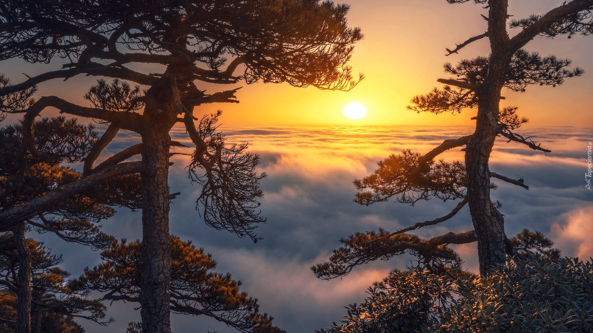 Edytor tapety: Sosny na tle słońca nad mgłą