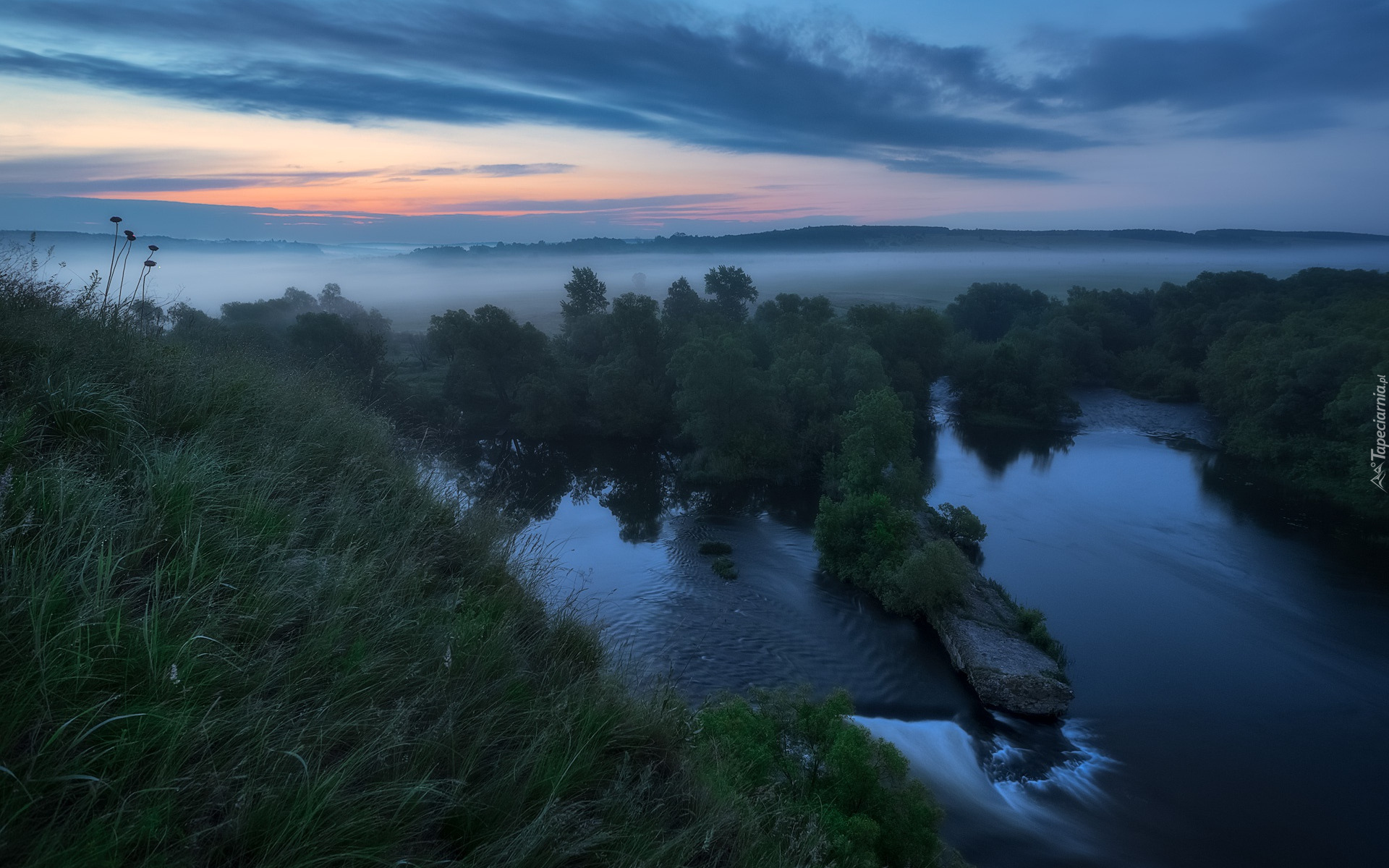 Edytor tapety: Mgła nad drzewami i rzeką
