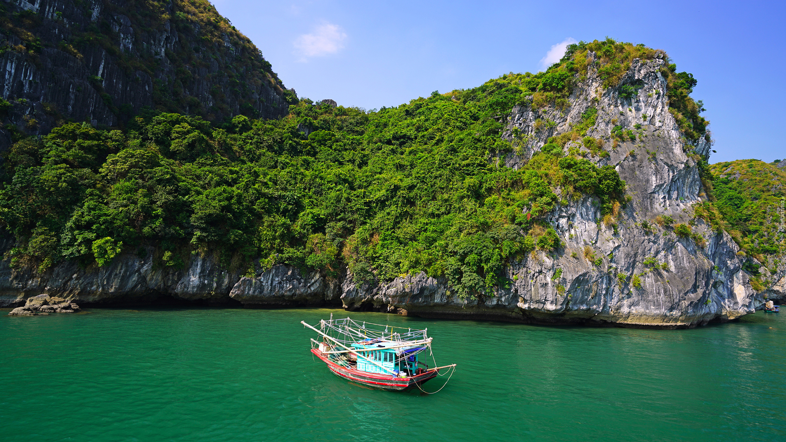 Edytor tapety: Łódka na morzu przy zadrzewionej skale