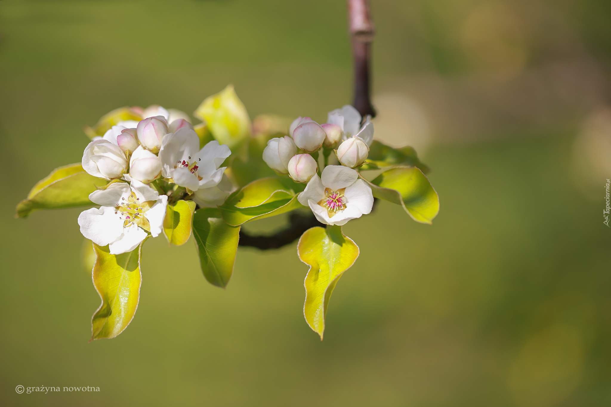 Edytor tapety: Kwiaty jabłoni z liśćmi na gałązce