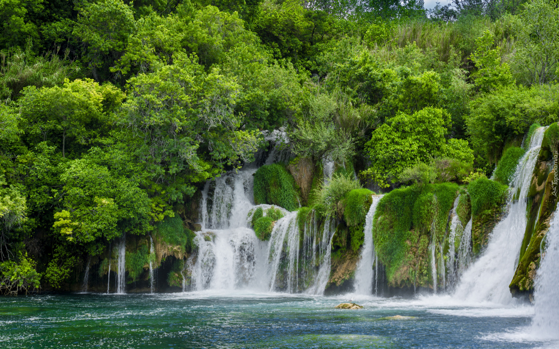 Edytor tapety: Wodospad otoczony zielonymi drzewami