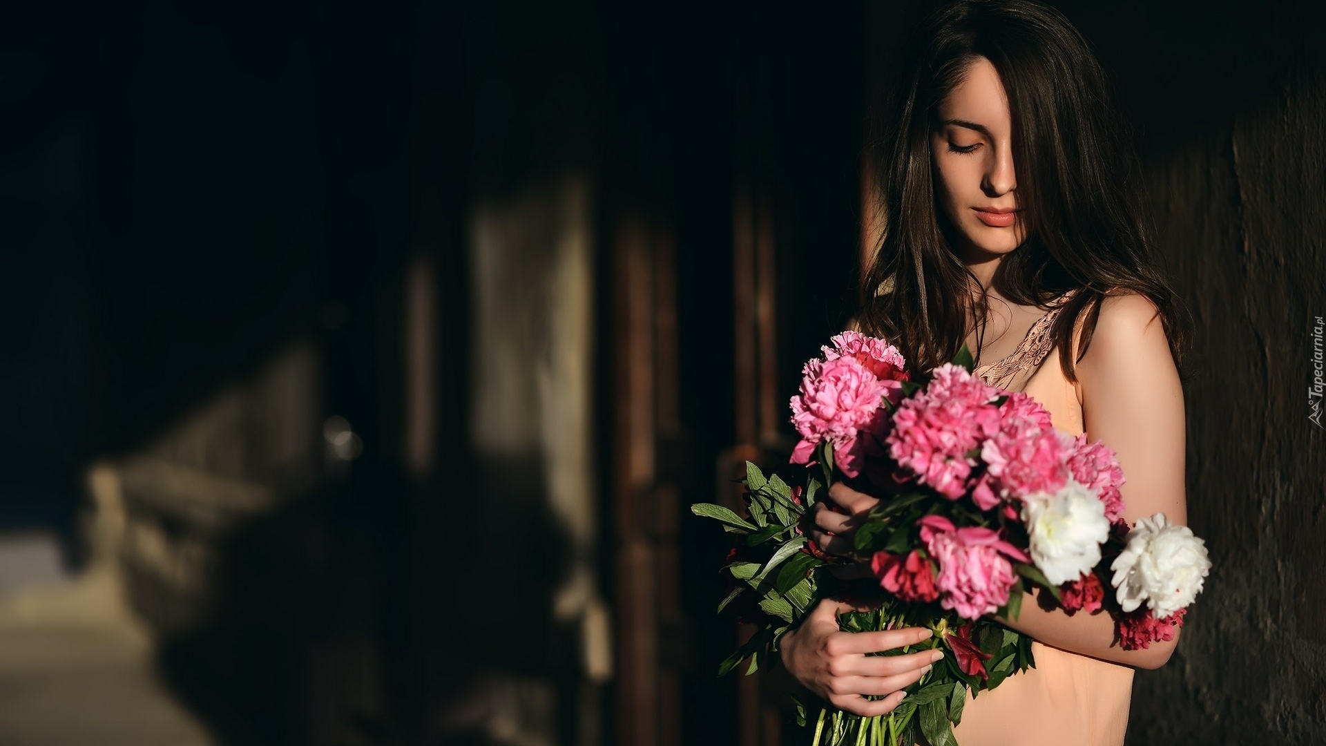 Edytor tapety: Kobieta z bukietem piwonii