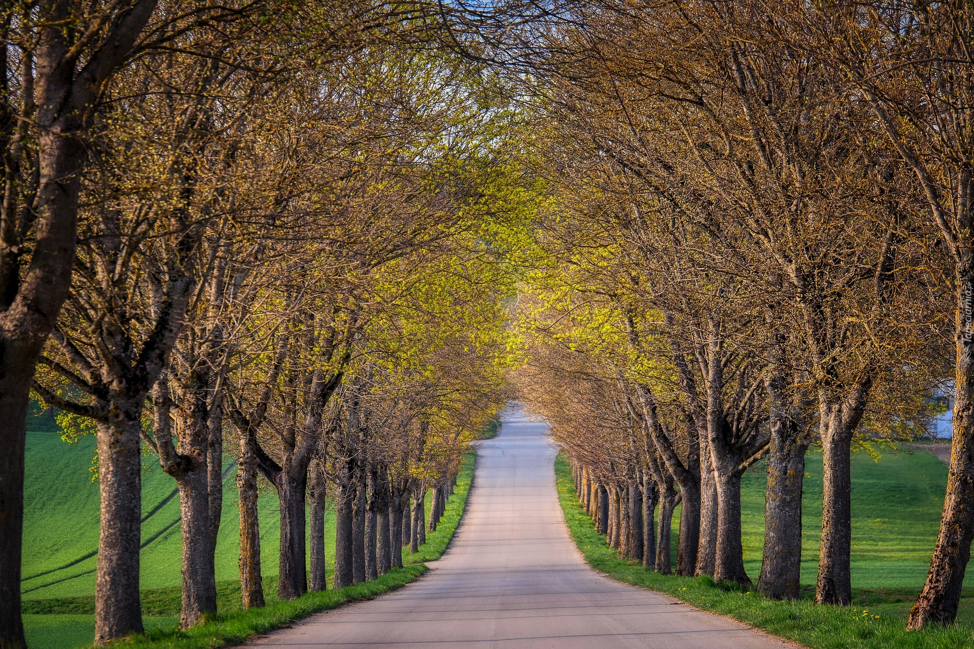 Edytor tapety: Szpalery drzew przy drodze wiosenną porą