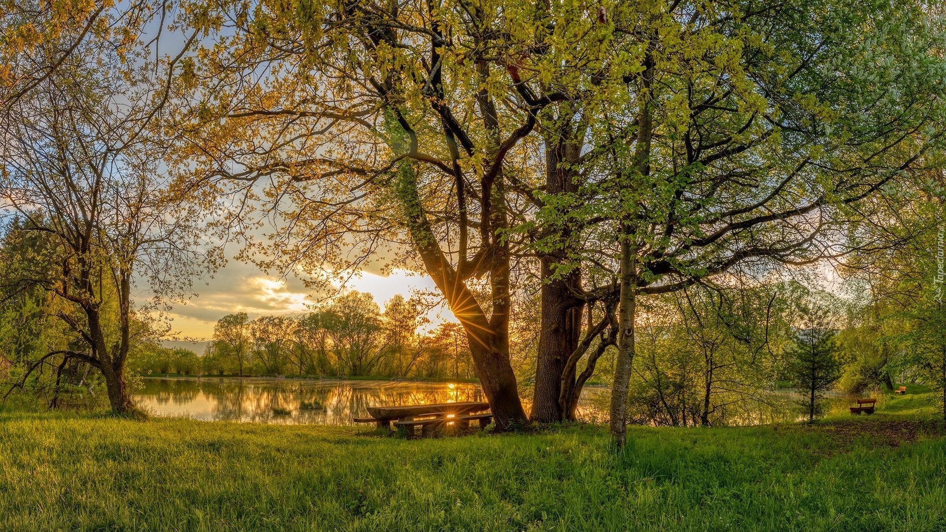 Edytor tapety: Ławki pod zielonymi drzewami nad stawem